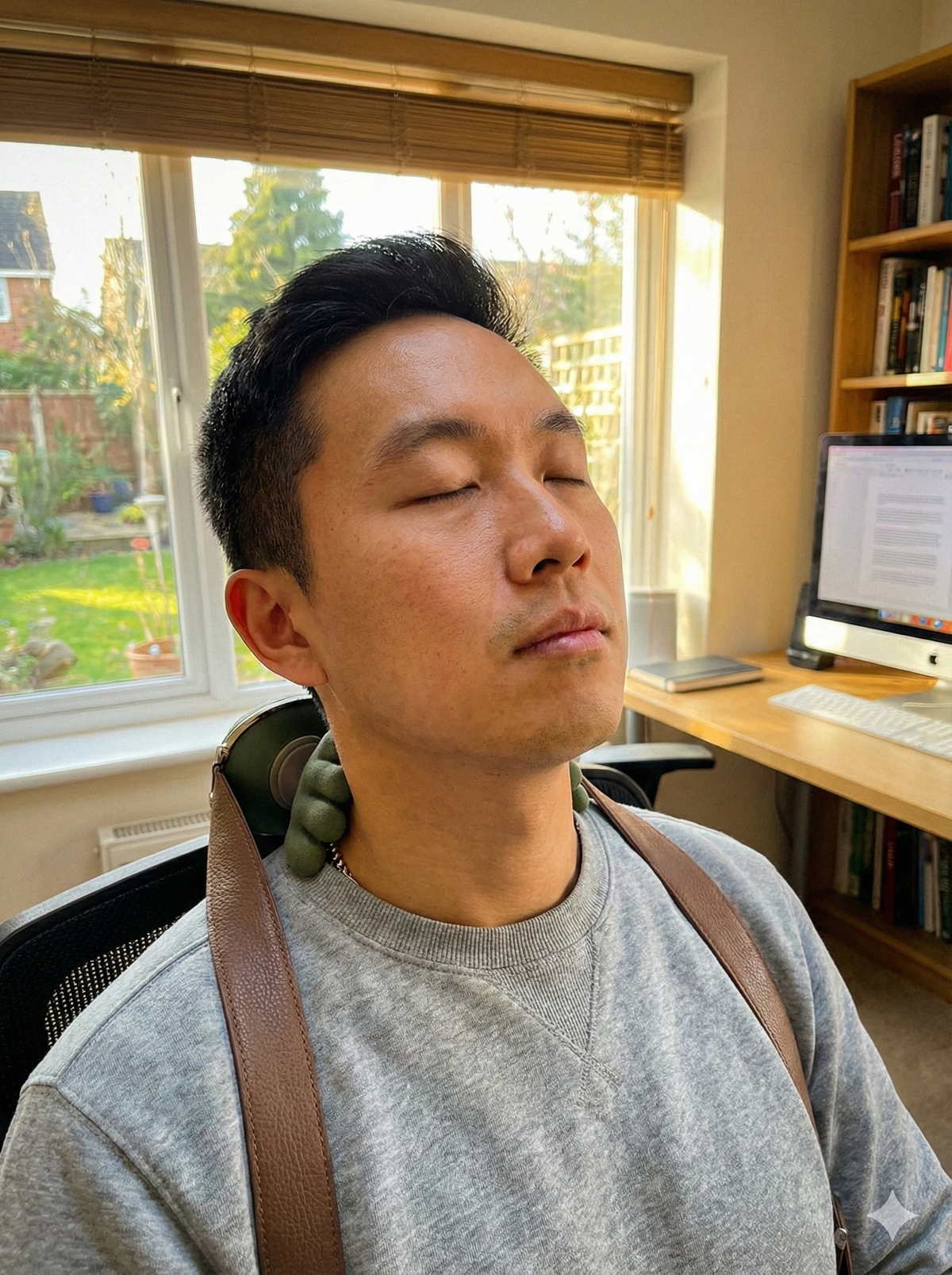 - Action: Sits directly on the "Stress Zone" with deep, heated pressure.